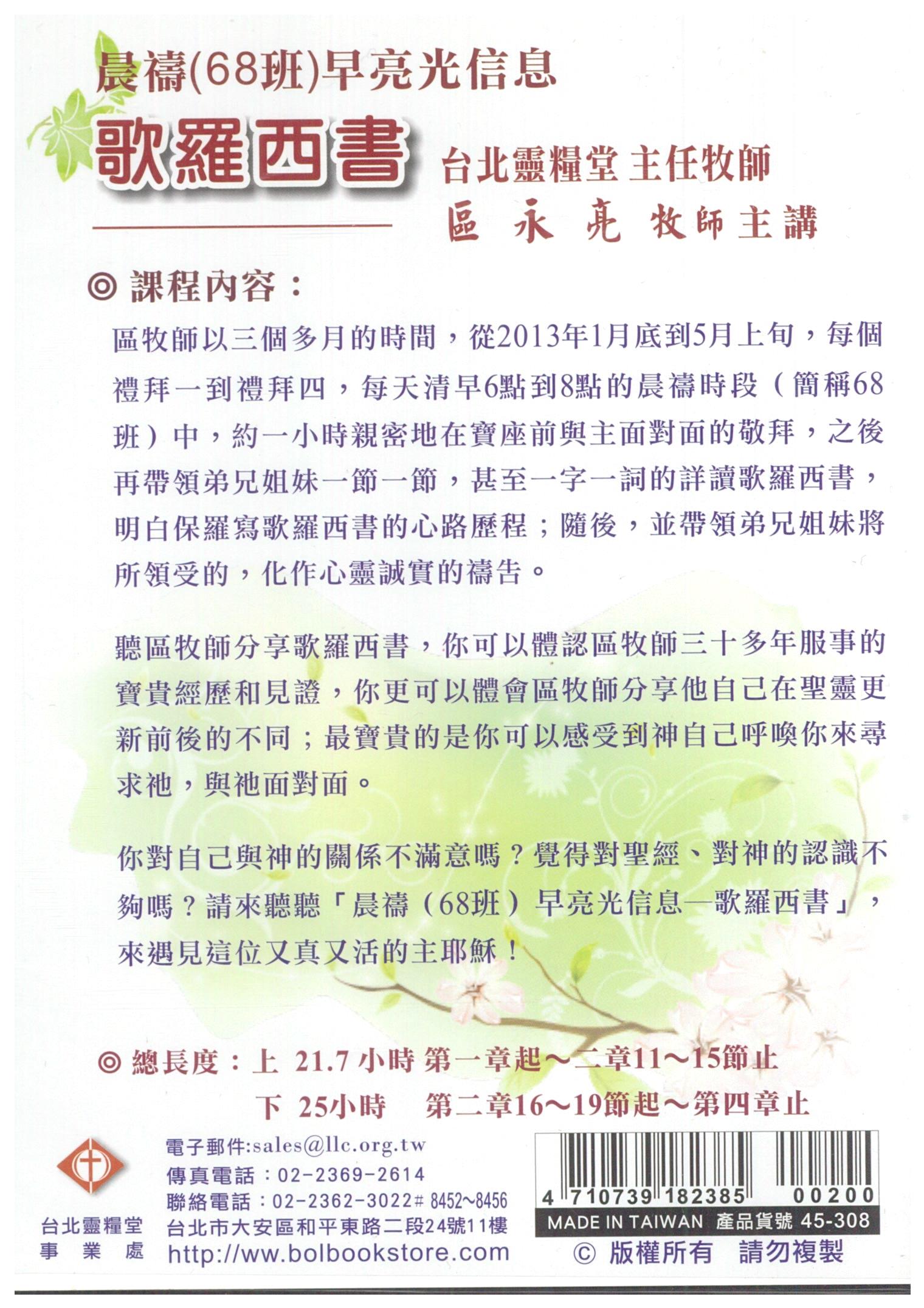 裝備課程-歌羅西書MP3+PDF講義檔案 作者 : 區永亮 牧師 出版社 : 靈糧影音綠標 商品語言: 繁體中文 裝訂: 貨品尺寸/規格:13.5 X 19 cm 限制數量: 供貨狀態: 譯者 : 出版日期: 2014/08/21 頁數: 適用分類: 全 運送條件: 不拘 (商品可訂購,結帳後立刻為您進貨,請安心訂購) 調貨說明 NT$180 NT$200 折扣: 9 折 數量: 放入購物車 加入追蹤清單 分享: 商品介紹 作者簡介 目錄 書摘/導讀 推薦序 最近閱覽過的商品 買過這本書也買了