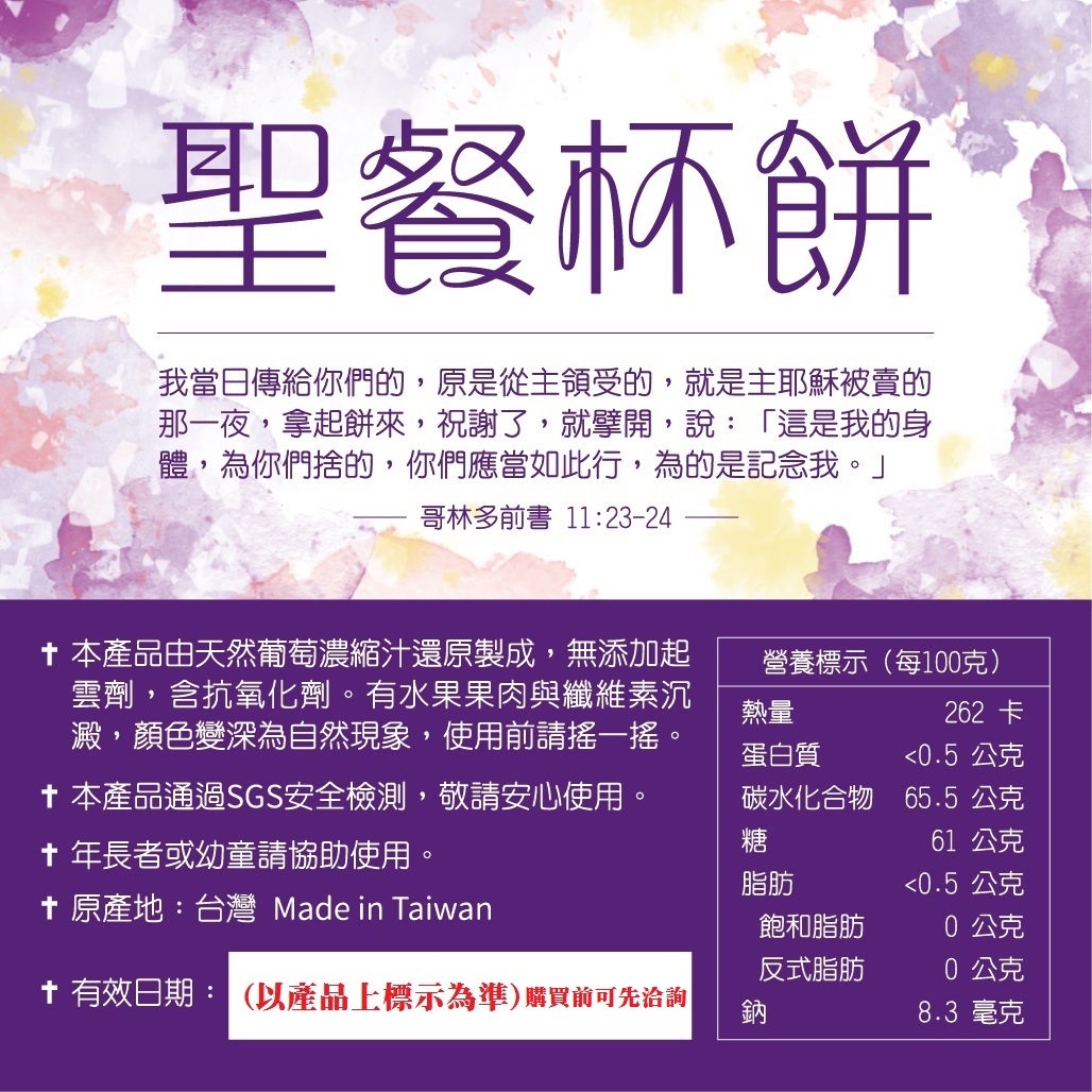 聖餐餅杯組-餅杯分離獨立包裝(10組/包) 作者 : 出版社 : 商品語言: 裝訂: 貨品尺寸/規格:14.7 X 21 cm 限制數量: 供貨狀態: 譯者 : 出版日期: 頁數: 適用分類: 運送條件: 不拘 (商品可訂購,結帳後立刻為您進貨,請安心訂購) 調貨說明 2026/12/19到期:90 元 NT$90 折扣: 0 折 數量: 放入購物車 加入追蹤清單 分享: 商品介紹 作者簡介 目錄 書摘/導讀 推薦序 【聖餐杯餅組】(每包10組) ●數量:葡萄汁與聖餐各10入。 ●本產品由天然葡萄汁濃縮還原製成,有水果果肉及纖維素沉澱,無添加起雲劑,使用前請搖一搖。含有抗氧化劑,顏色變深為自然現象。 ●本產品已通過SGS安全檢測,敬請安心使用。 ●年長者或幼童請協助使用。 ●原產地:台灣 Made in Taiwan ●有效期限標註於包裝上。 最近閱覽過的商品 買過這本書也買了