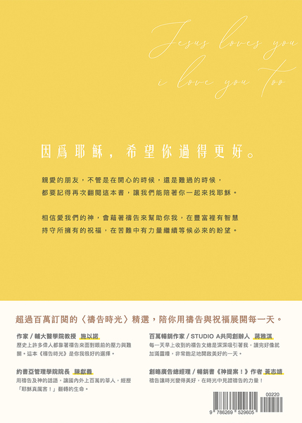 從來不知道這是哪一群人?或者是哪一個單位的禱告文?但是每一天早上總是深深吸引著我,讀完好像就加滿靈糧,非常飽足地開啟美好的一天。我的小組、媽咪們的群組,還有不知道多少位不認識天父的好友,都因為禱告時光與神更親近,讓自己的生命重新得力。不知道怎麼禱告或者不認識這位上帝嗎?沒關係,翻開《禱告時光》,你的生命會有截然不同的意義。──百萬暢銷作家/STUDIO A共同創辦人 蔣雅淇