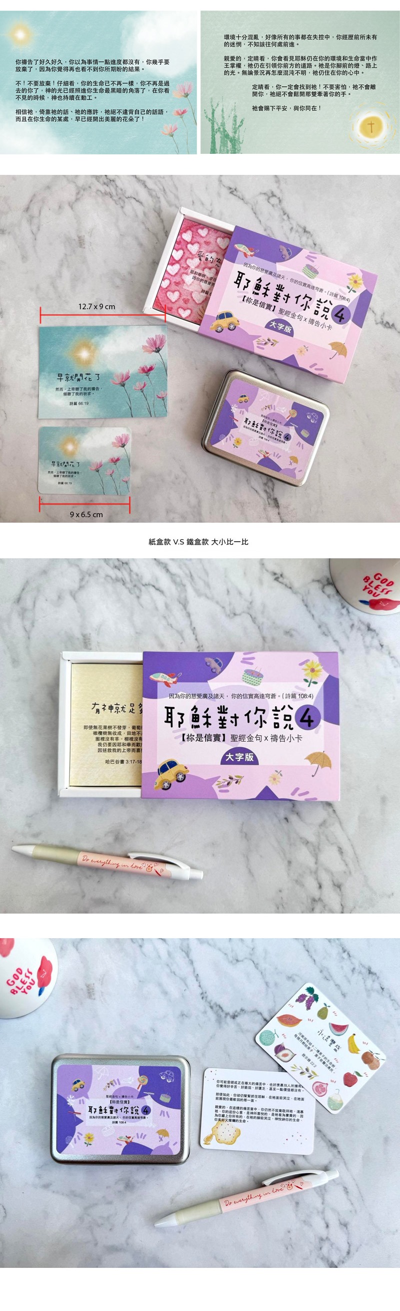 耶穌對你說4-經文卡40入-大字版(紙盒)--祢是信實 作者 : 下睫毛。繪畫生活 出版社 : 下睫毛設計 商品語言: 繁體中文 裝訂: 紙盒裝 貨品尺寸/規格:14.2 x 10.7 x 2.5 cm 限制數量: 供貨狀態: 譯者 : 出版日期: 2023/10/01 頁數: 40張/盒 適用分類: 運送條件: 不拘 (商品可訂購,結帳後立刻為您進貨,請安心訂購) 調貨說明 NT$179 NT$199 折扣: 8.99 折 數量: 放入購物車 加入追蹤清單 分享: 商品介紹 作者簡介 目錄 書摘/導讀 推薦序 最近閱覽過的商品 買過這本書也買了