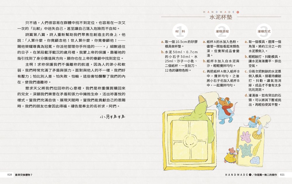 誰來交換禮物?(手作教學禮物書) 作者 : 楊美恩/林月娥/雷靜如 出版社 : 校園書房出版社 商品語言: 繁體中文 裝訂: 平裝/橫排 貨品尺寸/規格:13.5 X 17 CM 限制數量: 供貨狀態: 譯者 : 出版日期: 2025/09/01 頁數: 416 適用分類: 運送條件: 不拘 校園書響優惠79折起 (商品可訂購,結帳後立刻為您進貨,請安心訂購) 調貨說明 NT$150 NT$200 折扣: 7.5 折 數量: 放入購物車 加入追蹤清單 分享: 商品介紹 作者簡介 目錄 書摘/導讀 推薦序 ・˚⁺‧♡*。゚在破碎的友誼中,重新找到付出的勇氣・˚⁺‧♡*。゚ ✦6樣手作禮物教學提案 x 12封書信 ✦全彩印刷的精緻禮物書 ✦2025聖誕節送禮好選擇 這是一個關於交換禮物和友誼的故事, 美恩與小月姐姐不單交換禮物, 更在友誼關係裡分享真實的悲傷、脆弱與恐懼。 曾經,在美恩的心中,有過一座宛如樹屋的祕密基地, 在那祕密基地裡,她想望和朋友最真摯的交流、最真誠的來往, 沒有嫉妒比較,沒有欺騙利用,沒有誤會,沒有謊言, 更沒有那些讓人痛苦失望的不安、失落與破碎。 然而,事與願違的是, 美恩的樹屋凋零了, 因為一場與朋友的嚴重衝突,這座樹屋變得破敗不堪, 她不再開心,也對人群充滿恐懼, 那些過往沉寂心中的自我懷疑和孤單再度浮現,逐步要吞噬她, 直到某一天,她開始看見關係中自己的樣貌,發現了丟失的自己, 那座樹屋,竟然再次開出一朵又一朵的小花……。 ✦深情推薦✦ 呂冠緯 | 均一平台教育基金會董事長兼執行長 黃柏威 | 作家、諮商心理師 黃瑽寧 | 馬偕兒童醫院兒童感染科主治醫師 蘇絢慧 | 璞成心遇空間心理諮商所所長 作者及全書繪者➀/六話故事 楊美恩|Meien Yang 將溫暖化為故事,將美好變成繪畫。 比起純美術,她更喜歡插畫與兒童繪本, 因為她相信故事與繪畫的結合, 能夠傳遞意義和價值到世界每個角落,鼓勵那些有需要的人。 曾以繪本作品The Boat and Whale入圍2022國際無字繪本大獎(SILENT BOOK CONTEST), 與作家思源老師合作繪本《我願意》,內容有可愛的小豬和豬爸爸。 作者➁/信件及手作禮物 林月娥|Yueh-er Lin 校園福音團契飛躍輔導,投身陪伴和輔導高中生多年, 喜歡透過各種獨具創意的形式來陪伴他們, 無論是縫紉小物、特調靈修和手做點心餅乾等, 她的手巧和文藝少女心, 造就無數學生的信仰,陪他們跨越青澀歲月。 作者➂/給師長與輔導的文章 雷靜如|Cherry Lei 校園福音團契多年的輔導,曾任國中老師, 喜愛和學生在一起的每個日子, 永遠和學生有說不完的話, 對他們而言她始終是個大姐姐, 活潑、愛玩、愛旅遊,更愛看韓劇。 楔子 第一話 藍色的筆 回應信函+手作禮物➀ | 水泥杯墊與貝殼擴香石 第二話 什麼才是朋友? 回應信函+手作禮物➁ | 苔球植栽 第三話 交換禮物 回應信函+手作禮物➂ | 抱抱餅乾 第四話 直尺城市 回應信函+手作禮物➃ | 檸檬塔 第五話 恢復 回應信函+手作禮物➄ | 小花手機掛繩 第六話 一個困難的邀請 回應信函+手作禮物➅ | 聖誕水果香料熱紅酒 ✩給父母、師長與輔導【如何陪伴孩子在同儕關係中成長?】 最近閱覽過的商品 買過這本書也買了