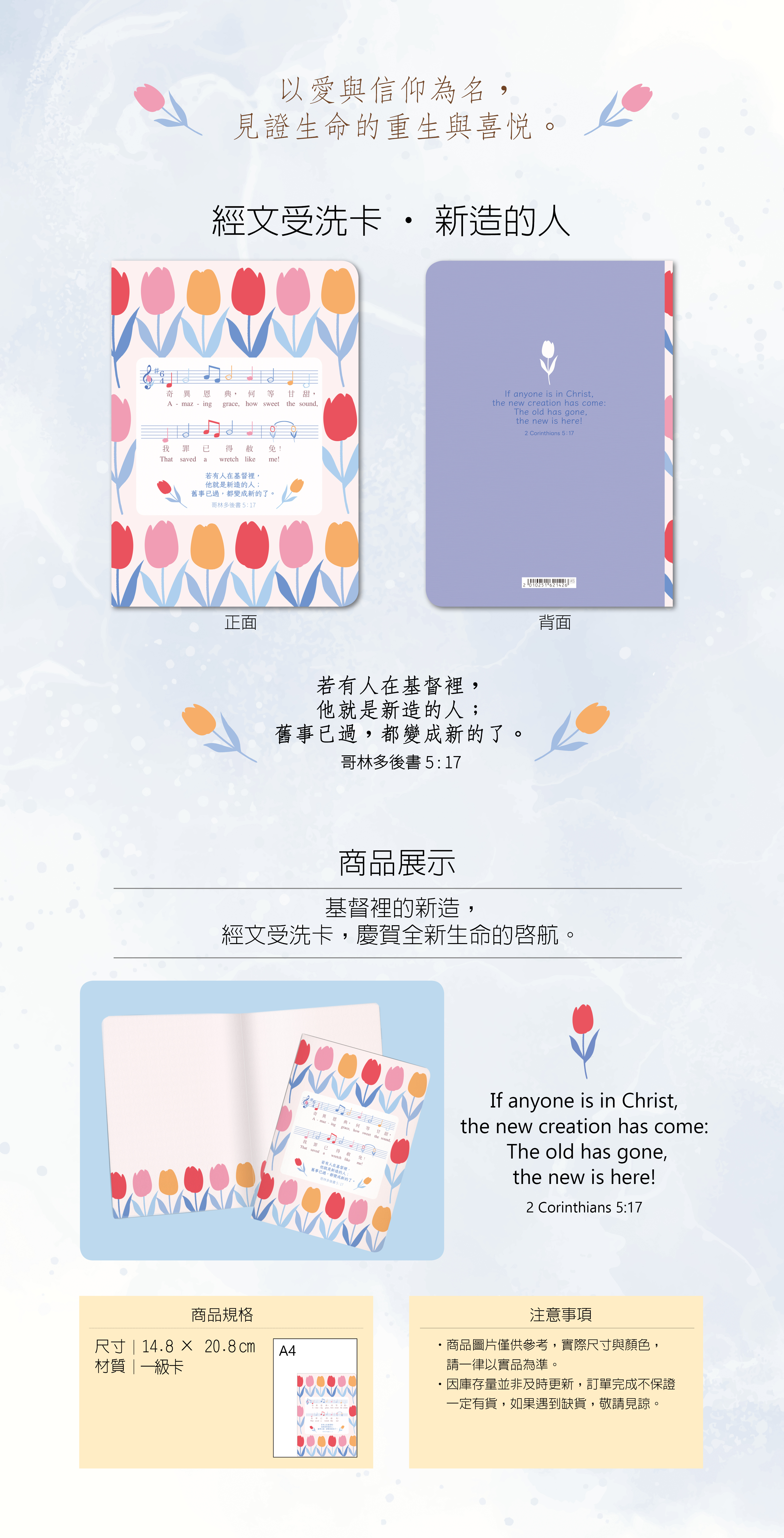 經文禮卡.受洗卡.受浸.中小開.多人祝福(2款可選) 作者 : 出版社 : 以琳書房 商品語言: 繁體中文/英文 裝訂: 貨品尺寸/規格:14.8 ×21 cm 限制數量: 供貨狀態: 譯者 : 出版日期: 2025/09/01 頁數: 適用分類: 全 運送條件: 不拘 (商品可訂購,結帳後立刻為您進貨,請安心訂購) 調貨說明 冠冕:41 元 花朵:41 元 NT$45 折扣: 0 折 數量: 放入購物車 加入追蹤清單 分享: 商品介紹 作者簡介 目錄 書摘/導讀 推薦序 建議使用油性筆書寫 最近閱覽過的商品 買過這本書也買了