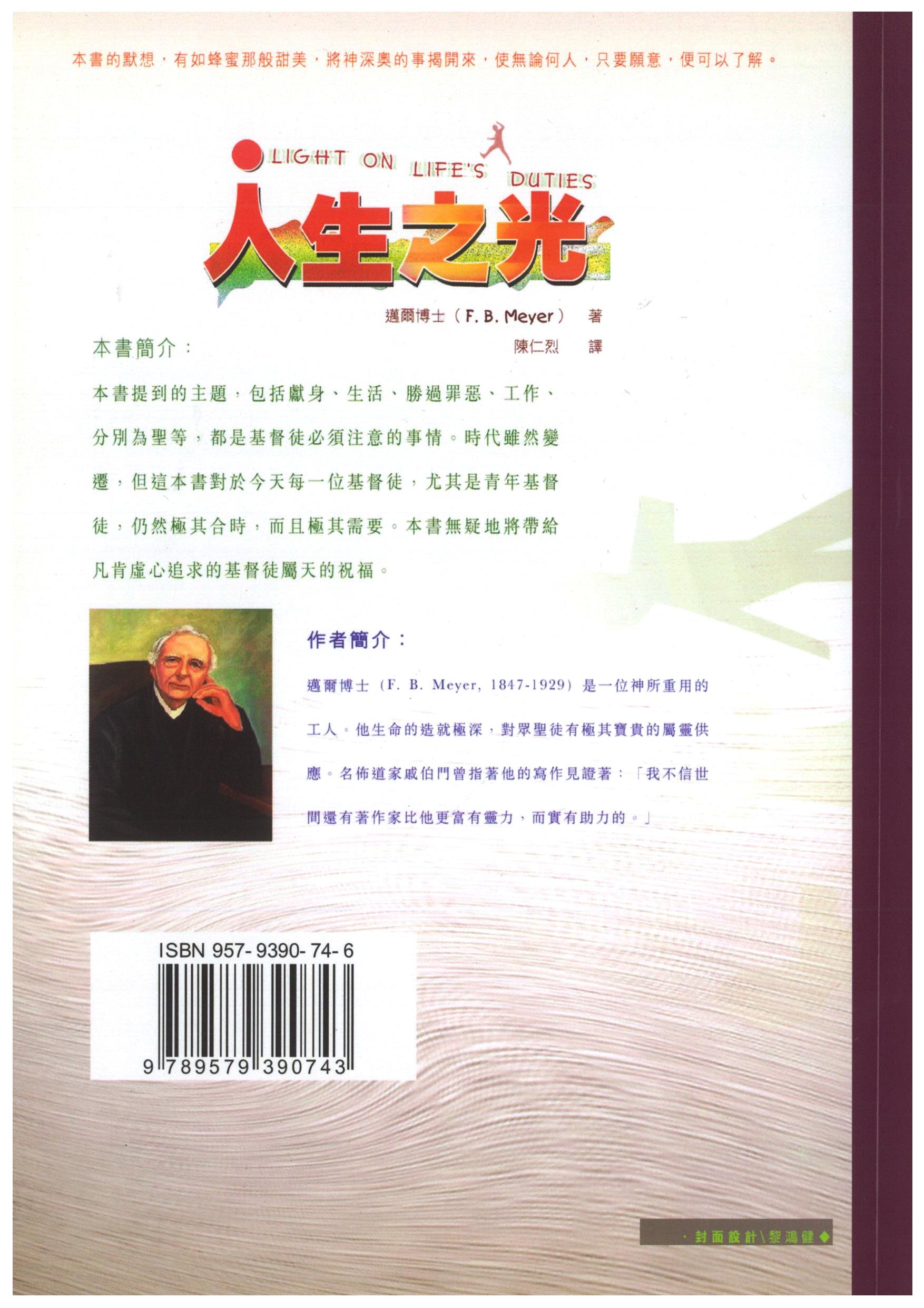 人生之光 作者 : 邁爾 出版社 : 提比哩亞 商品語言: 繁體中文 裝訂: 平裝/橫排 貨品尺寸/規格:15 X 21 CM 限制數量: 供貨狀態: 譯者 : 陳仁烈 出版日期: 2004/08/01 頁數: 128 適用分類: 運送條件: 不拘 (商品可訂購,結帳後立刻為您進貨,請安心訂購) 調貨說明 NT$117 NT$130 折扣: 9 折 數量: 放入購物車 加入追蹤清單 分享: 商品介紹 作者簡介 目錄 書摘/導讀 推薦序 本書的默想,有如蜂蜜那般甜美,將神深奧的事揭開來,使無論何人,只要願意,便可以了解。 本書提到的主題,包括獻身、生活勝過罪惡、工作、分別為聖等,都是基督徒必須注意的事情。時代雖然變遷,但這本書對於今天每一位基督徒,尤其是青年基督徒,仍然極其合時,而且極其需要。本書無疑地將帶給凡肯虛心追求的基督徒屬天祝福。 邁爾博士(F. B. Meyer, 1847-1929) 是一位神所重用的工人,他生命的造就極深,對眾聖徒友及其寶貴的屬靈供應。名佈道家戚伯門曾指著他的寫作見證著:「我不信世間還有著作家比他更富有靈力,而實有助力的。」 1. 王宮 2. 失落的音符尋到了 3. 勝過罪惡的秘訣 4. 蒙福生活的初步 5. 分別為聖屬基督 6. 如何讀聖經 7. 平凡的工作 8. 青年人,勿漂泊 9. 一封寫給青年女基督徒的信 10. 生活七則 最近閱覽過的商品 買過這本書也買了