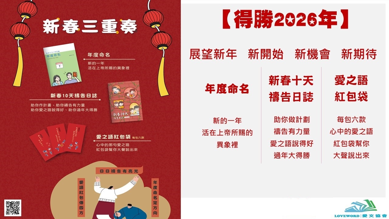 (限量)2026得勝新春組合包--年度命名+新春10天禱告日誌+愛之語紅包袋 作者 : 楊寧亞 出版社 : 愛文協會 商品語言: 繁體中文 裝訂: 貨品尺寸/規格:13 X 18 CM 限制數量: 供貨狀態: 譯者 : 出版日期: 2025/12/01 頁數: 6 適用分類: 運送條件: 不拘 (商品可訂購,結帳後立刻為您進貨,請安心訂購) 調貨說明 NT$100 NT$150 折扣: 6.67 折 數量: 放入購物車 加入追蹤清單 分享: 商品介紹 作者簡介 目錄 書摘/導讀 推薦序 最近閱覽過的商品 買過這本書也買了