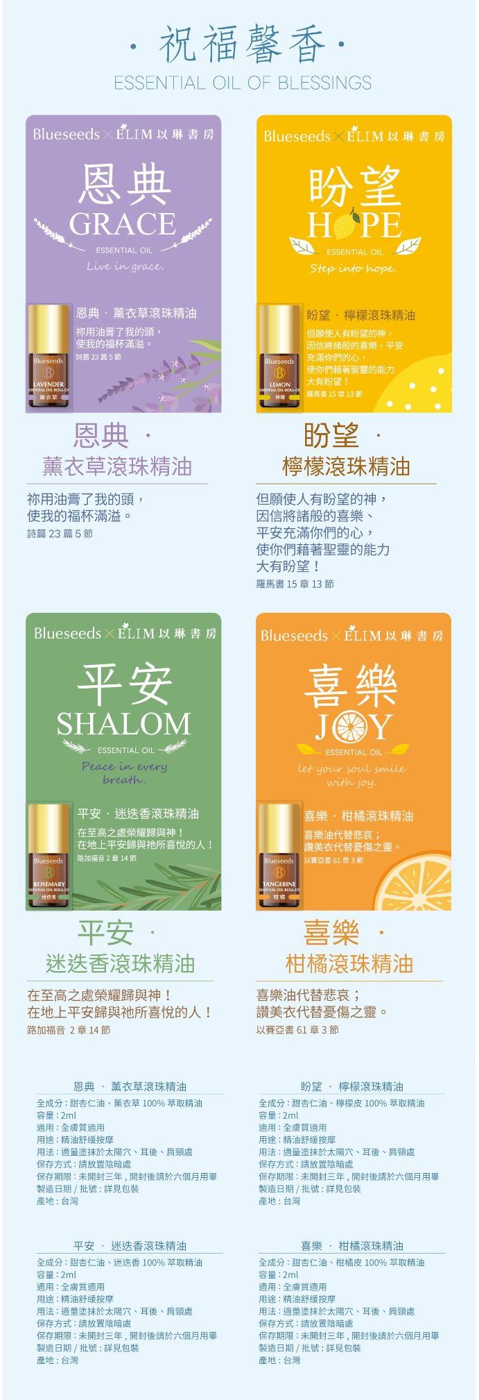 (大+小優惠組)以利亞-舒眠複方滾珠按摩精油--Blueseeds X ELIM 作者 : 出版社 : 芙彤園 商品語言: 裝訂: 貨品尺寸/規格: 限制數量: 供貨狀態: 譯者 : 出版日期: 2025/12/01 頁數: 5ml+2ml 適用分類: 運送條件: Blueseeds X ELIM 純淨精油福音商品 優惠期間: 2/28前 最純淨的精油 + 天上來的祝福 (商品可訂購,結帳後立刻為您進貨,請安心訂購) 調貨說明 1.舒眠+迷迭香:729 元 2.舒眠+柑橘:729 元 3.舒眠+薰衣草:729 元 4.舒眠+檸檬:729 元 NT$680 折扣: 0 折 數量: 放入購物車 加入追蹤清單 分享: 商品介紹 作者簡介 目錄 書摘/導讀 推薦序 我必安然躺下睡覺,因為獨有你─耶和華使我安然居住。 詩篇4篇8節 5ml以利亞舒眠精油 + 2ml任選優惠組 最近閱覽過的商品 買過這本書也買了