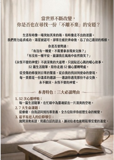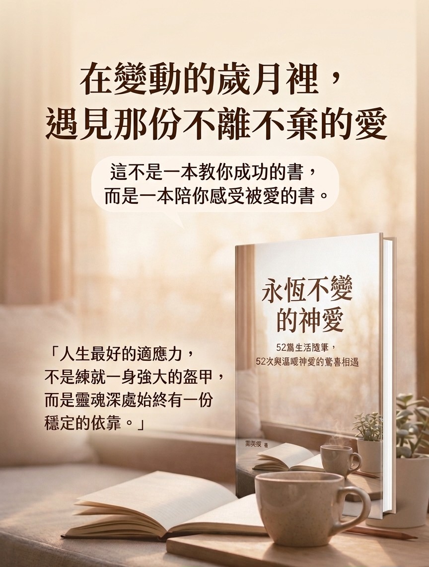 這本書的書名《永恆不變的神愛》,正是一個邀請。它想告訴每一位讀者:無論你現在正處於生命的高峰還是低谷,有一份愛從未離開過。 祂不像世俗的交易需要你拿表現來交換,也不會因為你的不完美而收回。這份愛,是生命的底色,是當你覺得走到盡頭時,重新看見希望的開始。