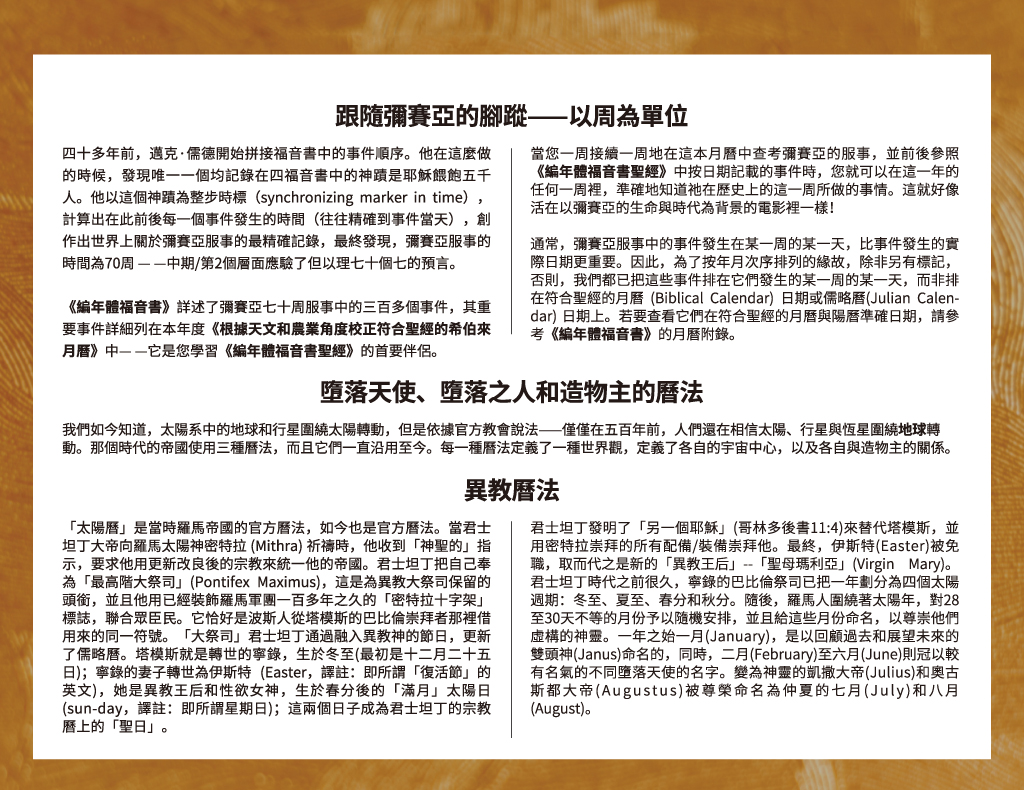 本年度根據天文和農業角度校正後符合聖經的希伯來月曆,聚焦那些蒙召為至高者代言的先知們的生平和他們所傳講的信息。