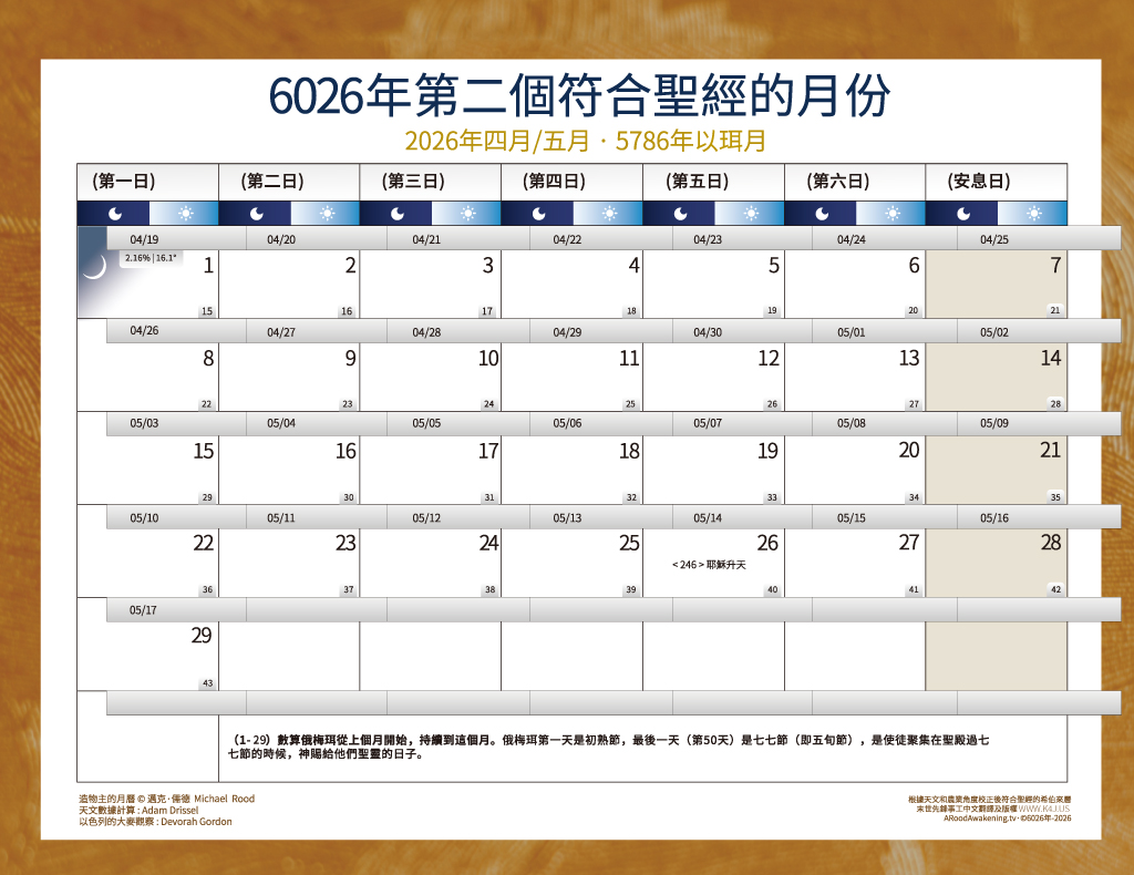 本曆法是為2026年春季耶路撒冷初熟大麥的收割而校正,並根據天文學計算方法預測出耶路撒冷最有可能出現新月的時間。
